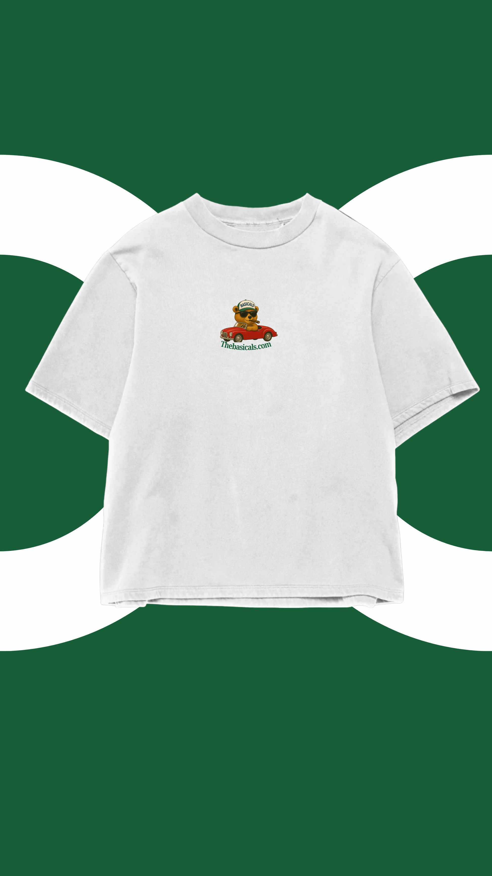 - Front Design: Features the iconic Basicals Bear cruising in a classic red car with “Thebasicals.com” print – a playful yet bold graphic that adds character to your fit.