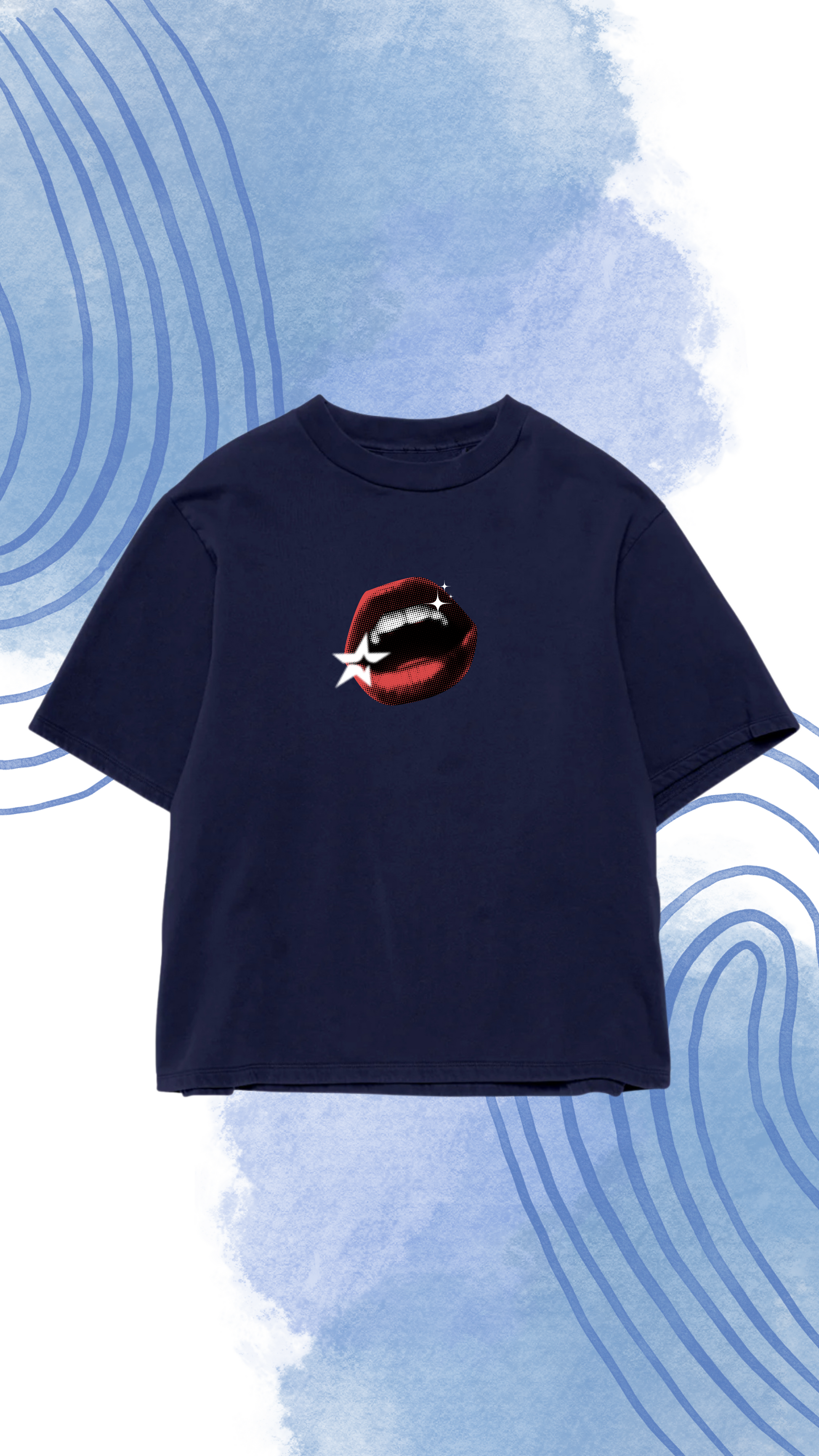 • Front Design: Bold graphic of glossy red lips with star accents – a statement piece that embodies boldness and allure.