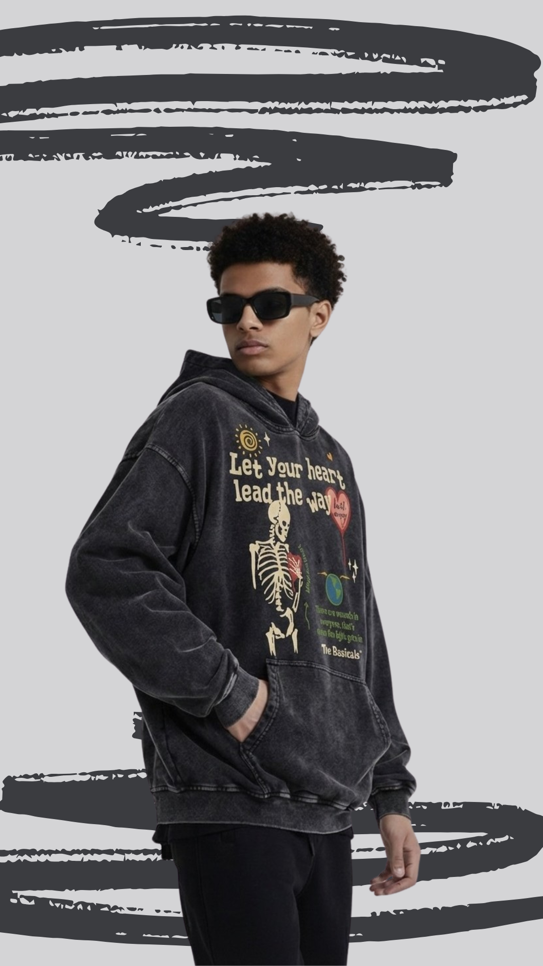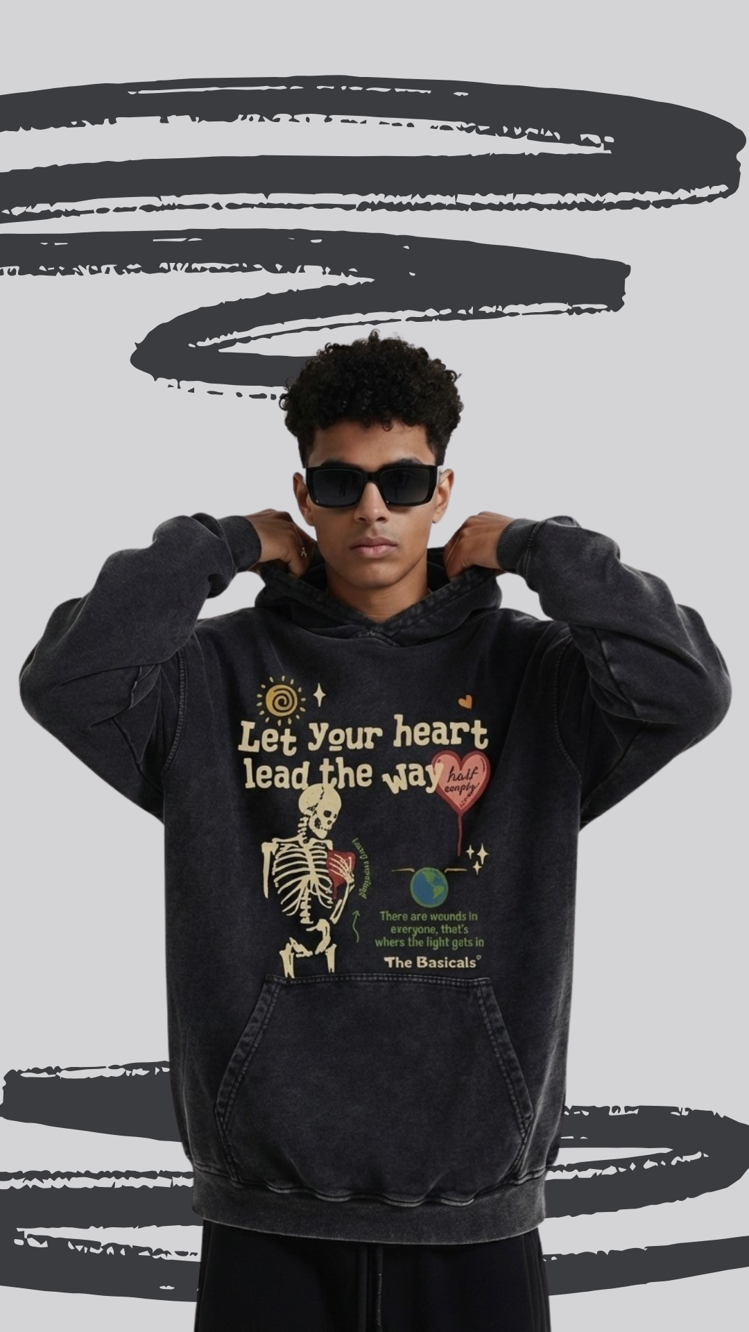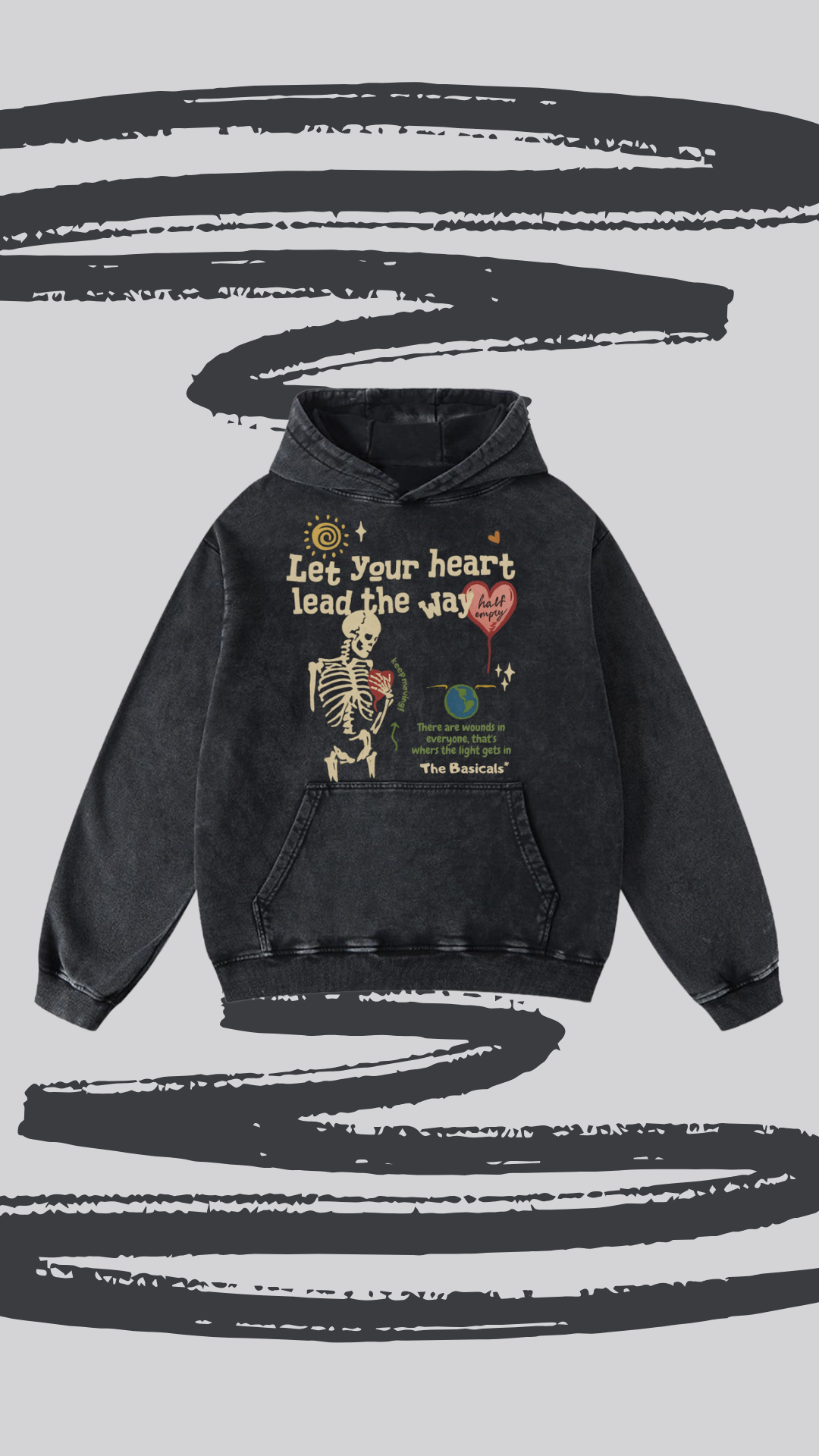 The front graphic tells a powerful story: a skeletal heart motif paired with hand-drawn elements and the message “Let your heart lead the way”, symbolizing vulnerability, resilience, and self-belief. Subtle detailing and The Basicals* signature elevate it from just merch to a statement piece.