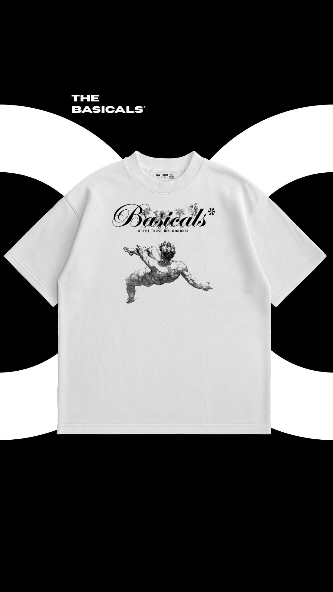 Make a bold statement with The Falling God T-shirt by The Basicals*. This premium white T-shirt features classical illustration of a falling figure — symbolising the human journey through struggle, healing, and triumph. Crafted from 100% soft, 200 GSM quality, breathable cotton, our product offers both visual power and everyday comfort.