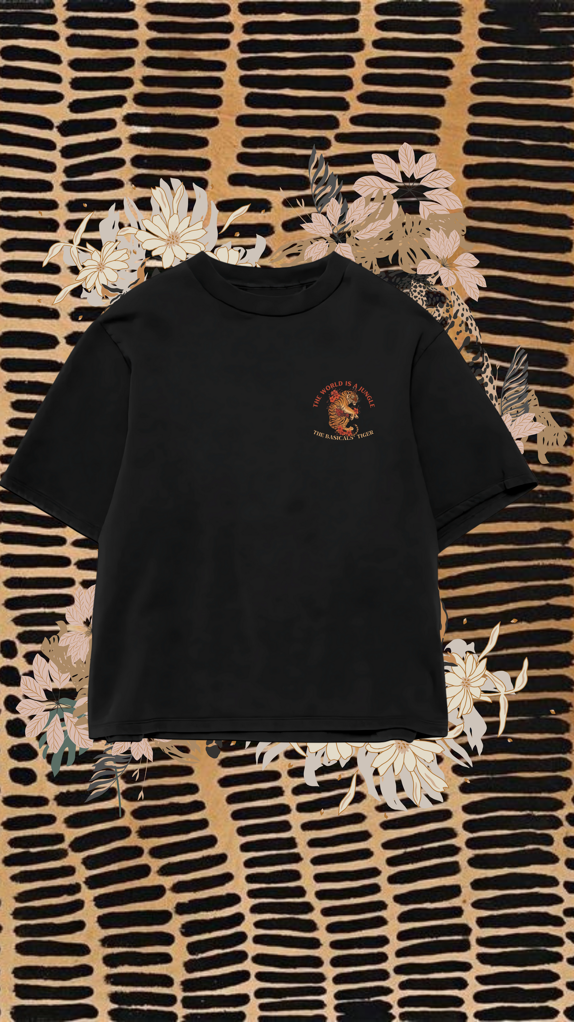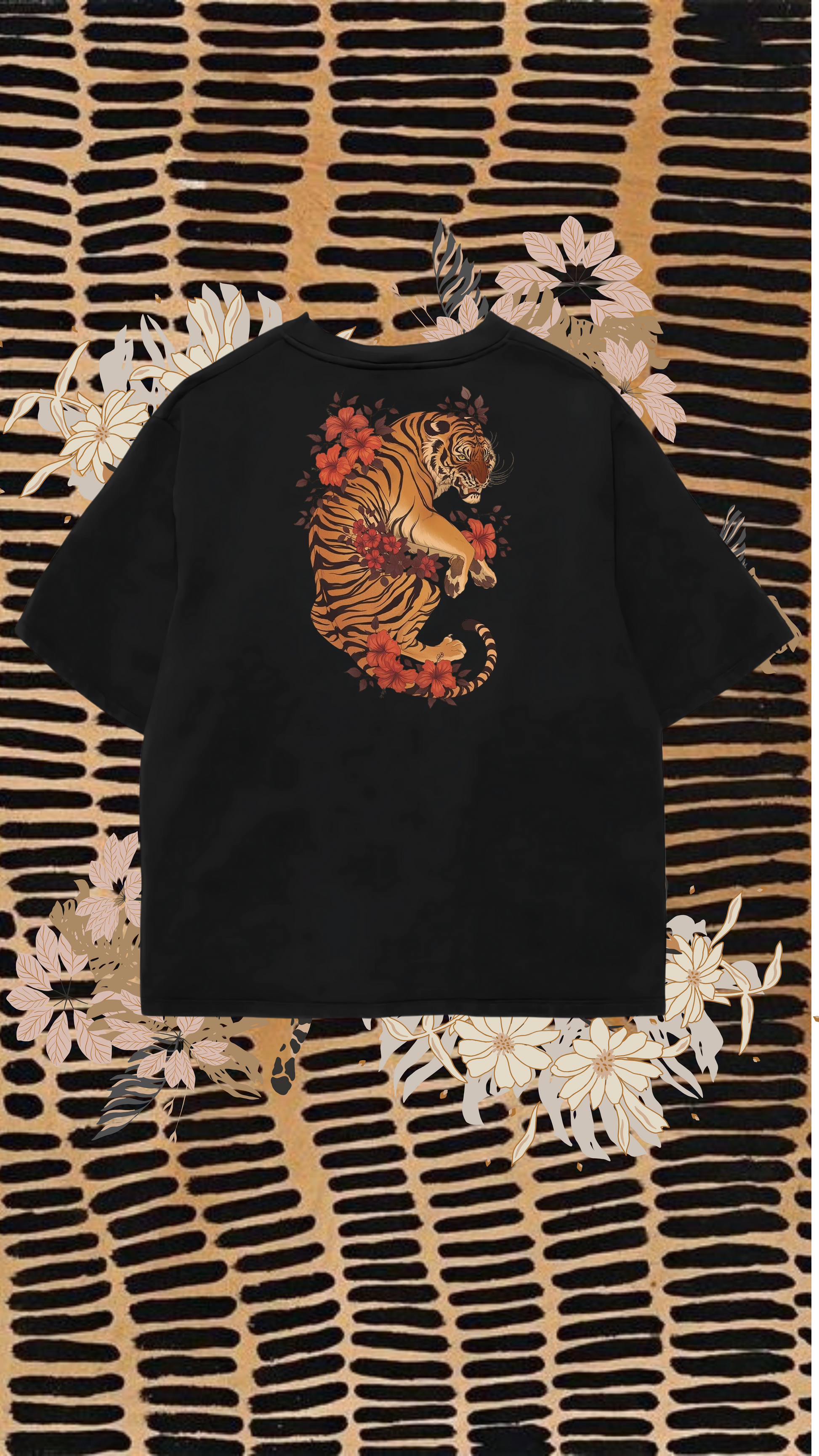 This bold black T-shirt features a striking illustration of a regal tigress encircled by vibrant red flowers, symbolizing both her fierce power and deep connection to the jungle she called home. The design captures her poised yet untamed nature – a reminder of her legendary battles, enduring legacy, and the beauty of India’s rich wildlife heritage.