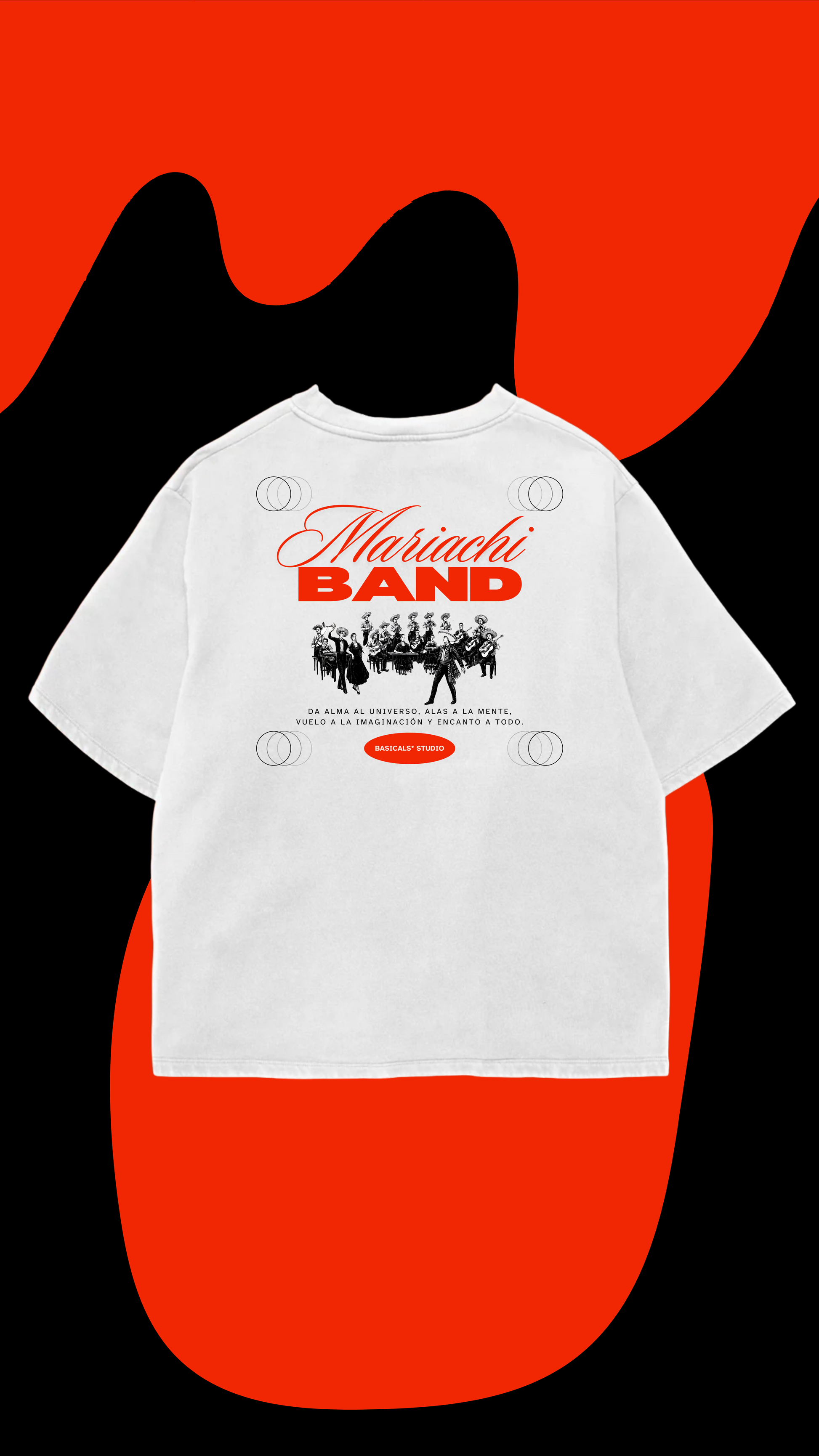 DTD Print on a 240G premium cotton body, this heavyweight tee embodies both comfort and attitude. The back graphic showcases a bold black-and-white Mariachi ensemble framed by expressive typography — “Mariachi Band” rendered in fiery red and elegant script, symbolizing passion and tradition in perfect harmony.